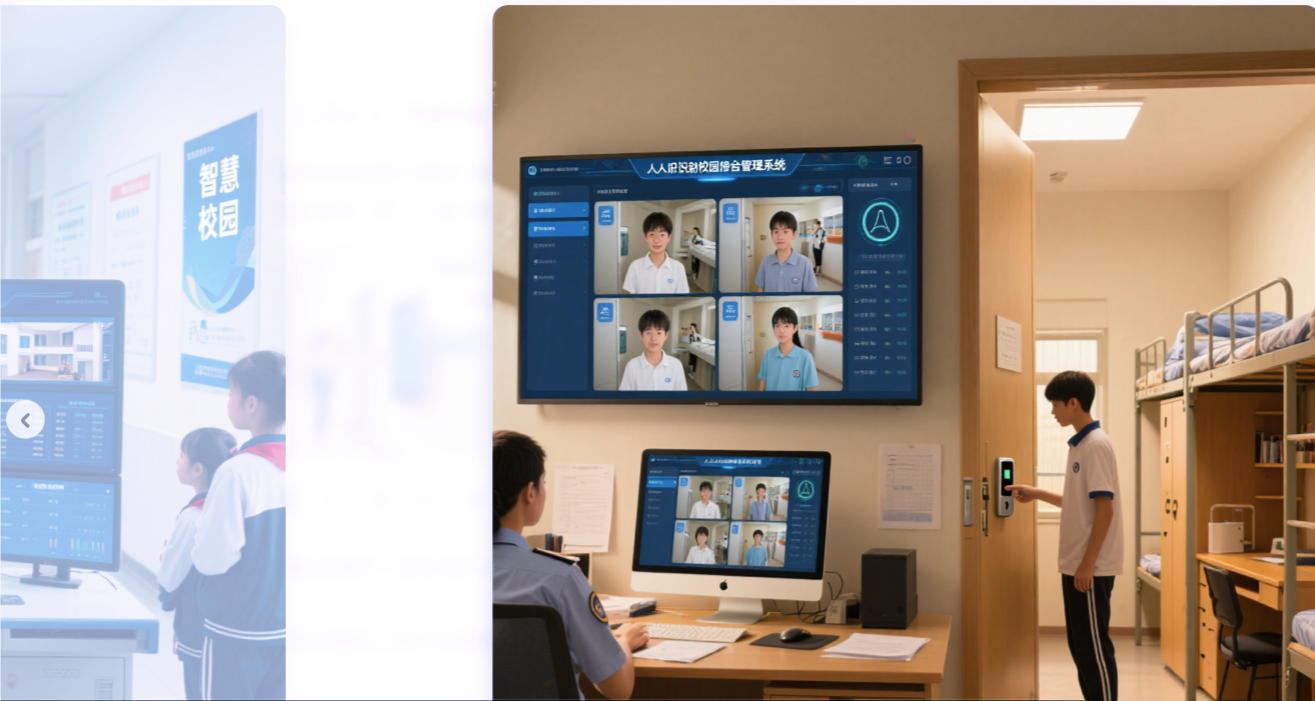 通過前端人臉識別設備采集數據,后端云平臺系統進行存儲和處理,提供實時監控和報警功能。攝像頭安裝在宿舍入口,自動記錄進入人員的面部信息,確保只有授權人員進入。